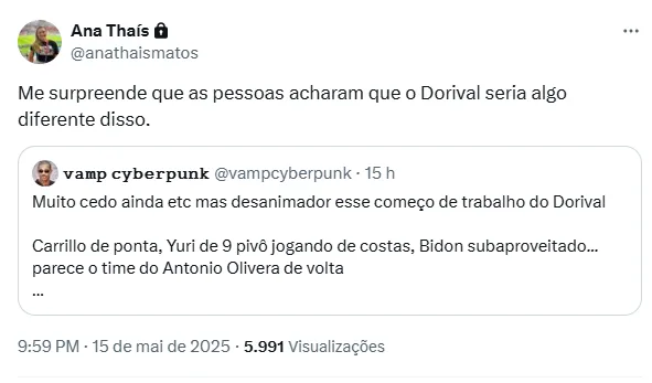 “Me surpreende que as pessoas acharam que o Dorival seria algo diferente disso.”, escreveu Ana Thaís, na plataforma X, ao abordar críticas envolvendo escolhas questionáveis do treinador.