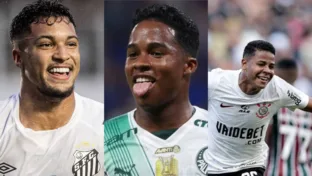 Marcos Leonardo, Endrick e Wesley com as camisas de Santos, Palmeiras e Corinthians, respectivamente (Raul Barreta / Santos / Cesar Greco / Palmeiras / Rodrigo Coca / Agência Corinthians)