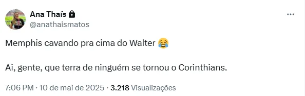 “Memphis cavando pra cima do Walter Ai, gente, que terra de ninguém se tornou o Corinthians.”, escreveu Ana Thaís, na plataforma X.