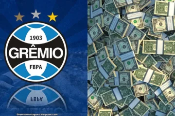 Logo do Grêmio e notas de dólar (Torcedores.com)