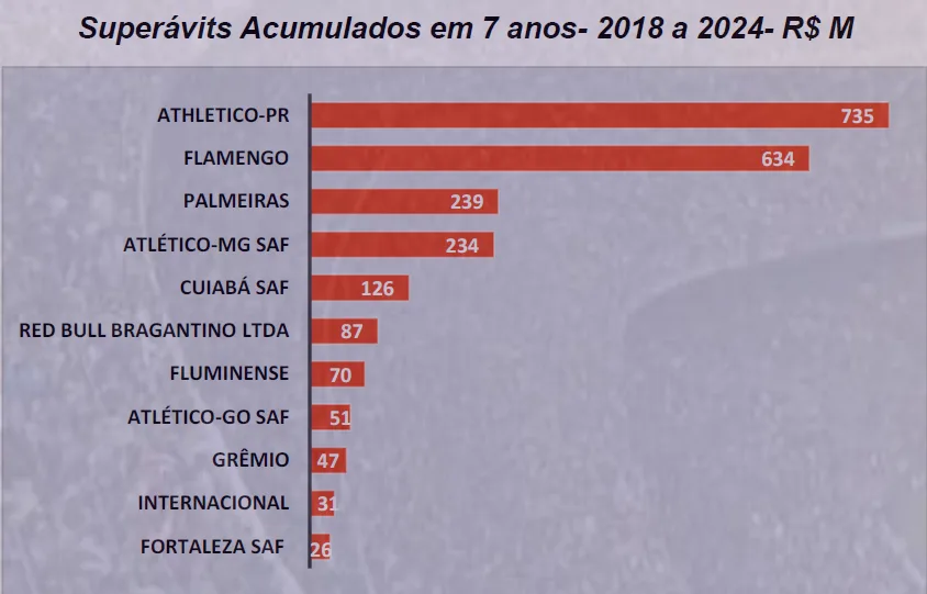 Porém o clube do Brasil com melhor desempenho financeiro no período é o Athletico-PR, que registrou R$ 735 milhões de 2018 a 2024. A equipe carioca aparece na segunda colocação, com R$ 634 milhões enquanto o time paulista vem em terceiro, com R$ 239 milhões.