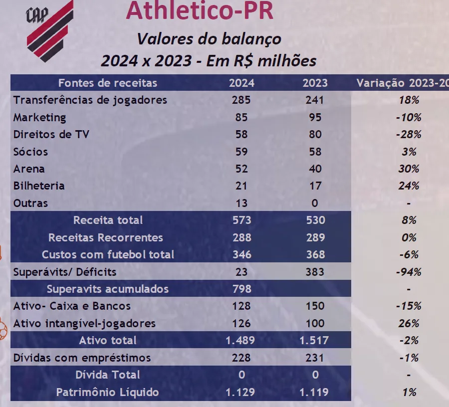 Apesar do destaque nacional, o Athletico-PR teve uma déficit de R$ 23 milhões em 2024, com destaque para a redução das suas receitas com direitos de TV e marketing.