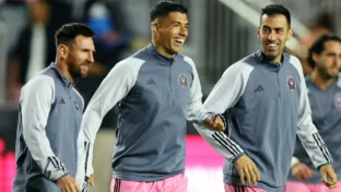 Messi, Suárez e Busquets em aquecimento antes de jogo do Inter Miami na MLS. (Créditos: Megan Briggs/Getty Images)