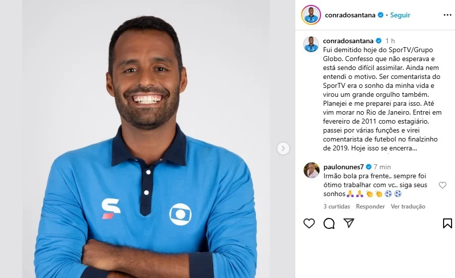 “Fui demitido hoje do SporTV/Grupo Globo. Confesso que não esperava e está sendo difícil assimilar. Ainda nem entendi o motivo […] Apesar de ser um dia difícil, de achar que não merecia, eu sou muito grato por esses 14 anos na Globo.”, escreveu Conrado Santana.