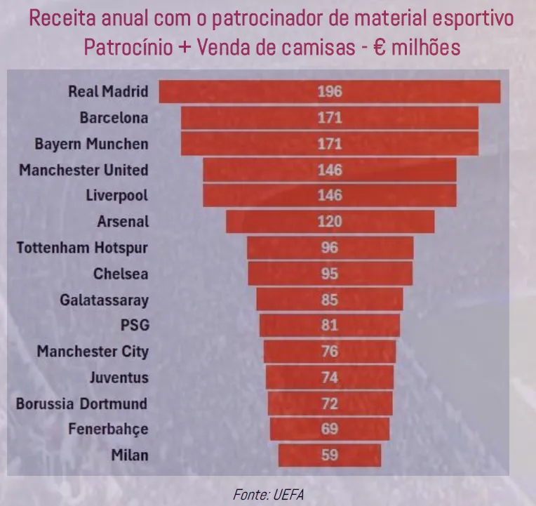 Venda de camisas e patrocinador esportivo renderam ao Real Madrid 196 milhões de euros, cerca de R$ 1,2 bilhão. Esse valor é superior ao que registraram Barcelona e Bayern de Munique, Top-3 neste quesito.