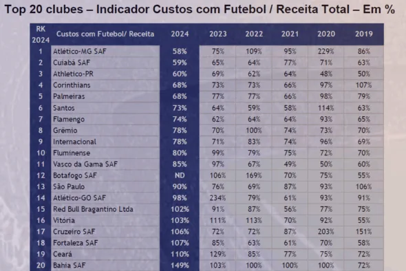 O cenário ideal é de gastos inferior a 80% do faturamento. E neste caso vale elogiar não só o Atlético-MG e Cuiabá como outros clubes em destaque no ranking. Dos 20 mapeamentos, os nove primeiros mantiveram sua proporção dentro da média ideal.