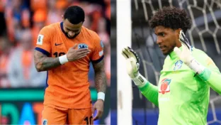 Memphis Depay e Hugo Souza, jogadores do Corinthians, com camisas da Holanda e do Brasil (X oficial seleção da Holanda / Rafael Ribeiro / CBF)