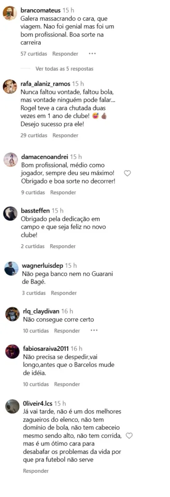 “Galera massacrando o cara, que viagem. Não foi genial, mas foi um bom profissional. Boa sorte na carreira”, desejou Branco Mateus no Instagram. “Nunca faltou vontade, faltou bola, mas vontade ninguém pode falar… Rogel teve a cara chutada duas vezes em um ano de clube! Desejo sucesso pra ele!”, escreveu Rafa Ramos.