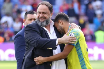 Evangelos Marinakis abraça Renan Lodi em jogo da Premier League. (Foto: Richard Heathcote/Getty Images)