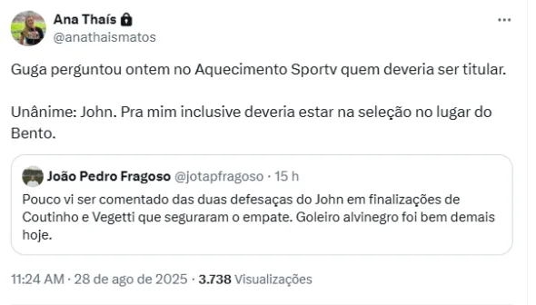 “Guga (Gustavo Villani) perguntou ontem no Aquecimento Sportv quem deveria ser titular. Unânime: John. Pra mim, inclusive, deveria estar na seleção no lugar do Bento.”, escreveu Ana Thaís, em publicação na plataforma X.