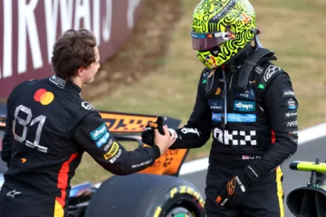Oscar Piastri (à esquerda) superou Lando Norris em nova batalha da McLaren, na Fórmula 1 (foto: Clive Rose/Getty Imagens)