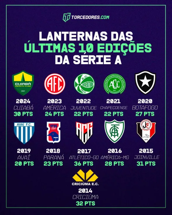 - Atlético-MG – 4 pontos em 5 jogos (2 gols de saldo) – 26,6%