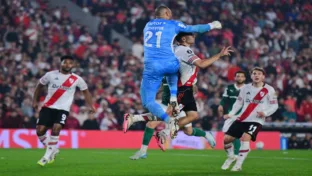 No lance, o goleiro do Verdão saiu do gol e deu uma ‘joelhada’ nas costas do jogador do time argentino, mas foi salvo pelo VAR, que anulou o lance por causa de impedimento de Montiel.