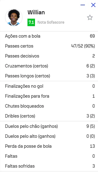 Aos 37 anos, Willian carrega uma ampla bagagem na carreira. Embora não tenha o mesmo vigor físico do passado, o meia-atacante do Grêmio ainda possui a capacidade de carregar a bola em velocidade e encontrar passes certeiros, situação que vem impressionando Chico Garcia.