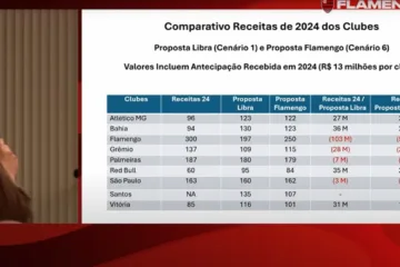 Clube Receitas 2024 Proposta Libra Proposta Flamengo Diferença (Libra) Diferença (Flamengo) Atlético MG 96 M 123 M 122 M +27 M +26 M Bahia 94 M 130 M 123 M +36 M +29 M Flamengo 300 M 197 M 250 M -103 M -50 M Grêmio 137 M 109 M 115 M -28 M -22 M Palmeiras 187 M 180 M 179 M -7 M -8 M Red Bull 60 M 95 M 84 M +35 M +24 M São Paulo 163 M 160 M 162 M -3 M -1 M Santos NA 135 M 107 M – – Vitória 85 M 116 M 101 M +31 M +16 M