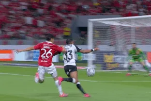Mas o responsável pelo VAR, Carlos Eduardo Nunes Braga, recomendou a revisão do lance para possível vermelho: “Ele pega a bola por cima, com a perna em riste e a trava no joelho do atleta (Borré)”.