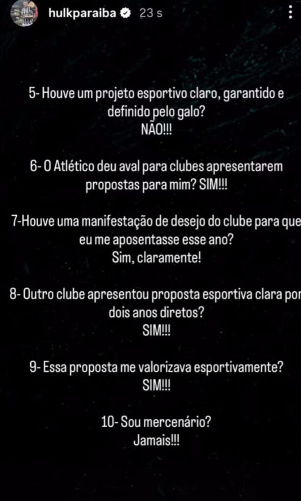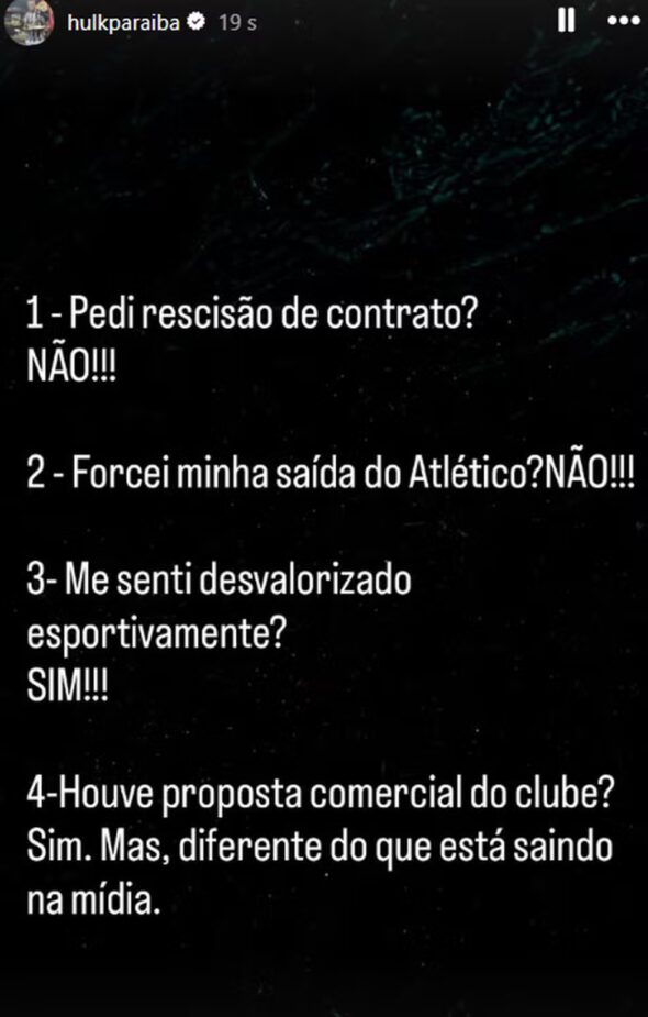 A novela envolvendo a saída ou não de Hulk do Atlético-MG pode ter ganhado os seus capítulos derradeiros na noite desta terça-feira. Em suas redes sociais, o jogador de 39 anos postou uma série de esclarecimentos, uma espécie de desabafo sobre todas as especulações que saíram na imprensa nos últimos dias. Primeiro, negou que tenha pedido rescisão para o Galo. Depois, revelou que se sente desvalorizado no clube mineiro.