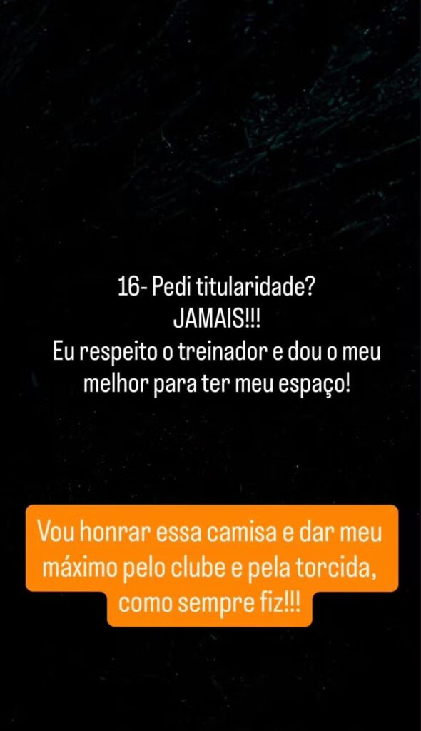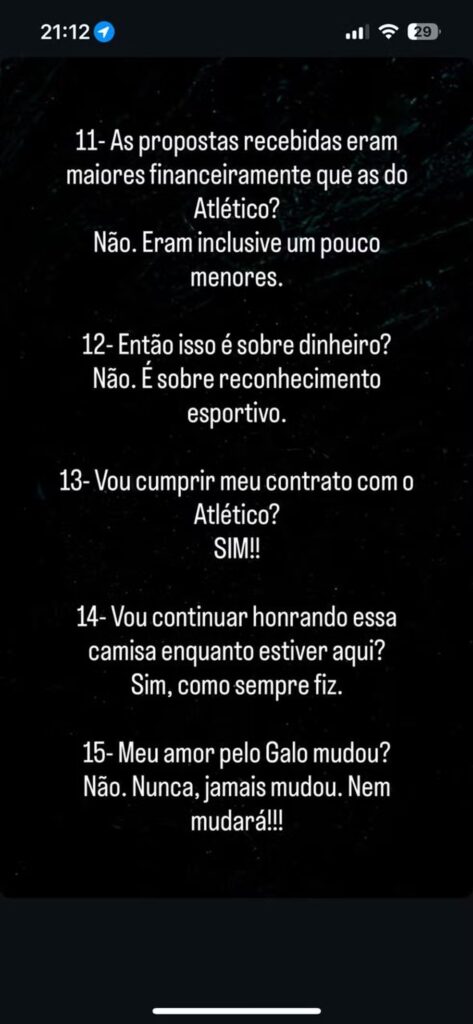 Outro assunto abordado pelo jogador de 39 anos foi um suposto pedido à diretoria do Galo para garantir a sua titularidade no time. Assim, Hulk afirmou que jamais pediu a titularidade para a diretoria ou para Jorge Sampaoli, que chegou a preteri-lo na reta final da temporada. O veterano revelou: “Eu respeito o treinador e dou o meu melhor para ter meu espaço!”.