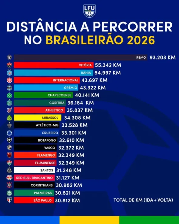 Essa distância é, de longe, a maior entre os clubes da Série A. Considerando o segundo colocado, o Vitória (55.342 km), a diferença é de quase 40 mil km. Em linha reta, o Remo poderia dar duas voltas na Terra se percorresse os 92.948 km. Ou seja, essa é a maior distância que um clube pode percorrer desde 2006.