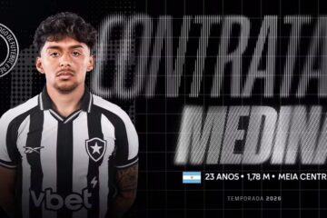 Depois de algumas idas e vindas, o volante Medina, enfim, foi anunciado de forma oficial pelo Botafogo. O meio-campista de 23 anos chega neste fim de semana para a realização de exames médicos e deve assinar um vínculo com o clube carioca até o fim de 2029.