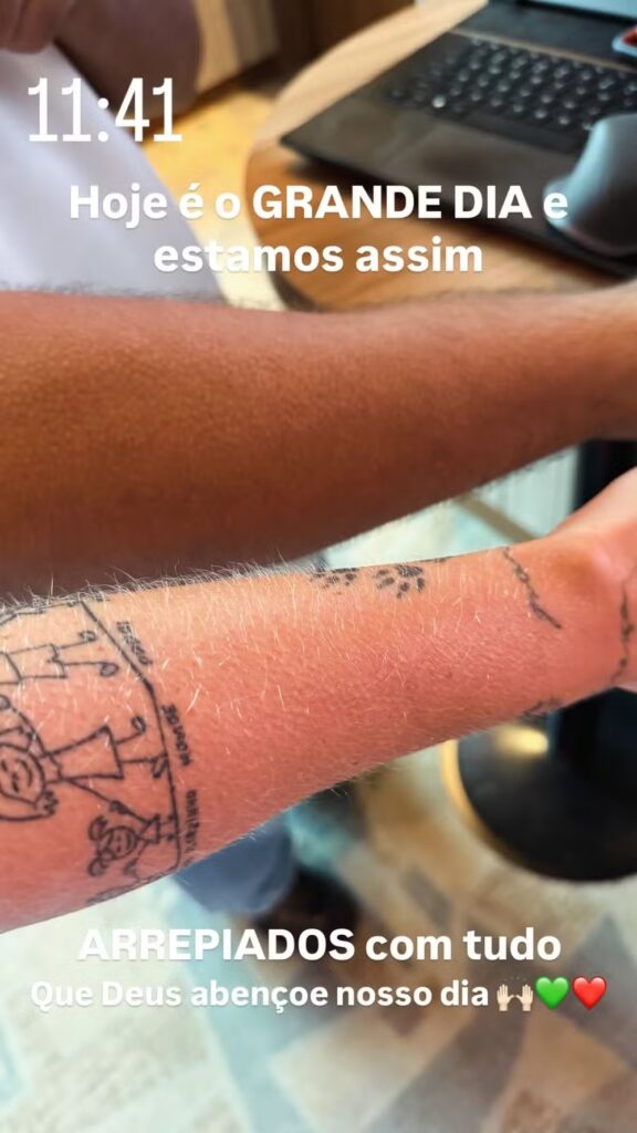 “Bom dia, meu amor! Esse café da manhã é para você me sentir mais perto e conectado com você nesse dia tão importante. Chegou o grande dia! Tranquilidade e alegria para esse dia tão importante para nós. Sua família estará lá para te acompanhar, e eu, de longe, também. Esse presente é para seu pé descansar até a hora de sambar muito. ‘Chegou sua hora de brilhar'”, escreveu o jogador.