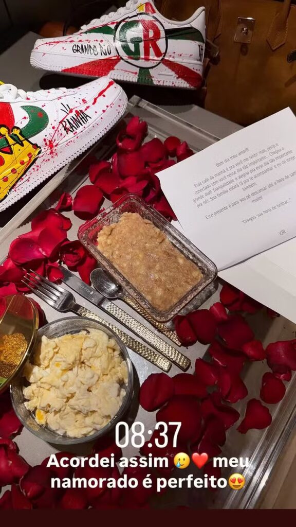Além de itens para o café da manhã e rosas, portanto, Vini também enviou um tênis personalizado com as cores da Grande Rio e com “rainha” escrito em suas laterais. A referência pode ou não ter duplo sentido: primeiro, pelo posto que a influenciadora ocupa na agremiação e, depois, no coração do jogador.