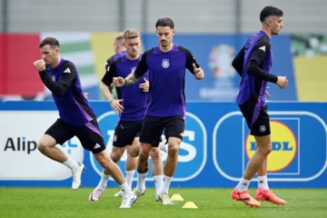 A partir da esquerda, os alemães Pascal Groß, Maximilian Mittelstädt, Robin Koch e Kai Havertz em ação durante o treinamento da equipe em Herzogenaurach, Alemanha, sexta-feira, 28 de junho de 2024. (Associated Press / Alamy Stock Photo)