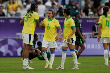 A brasileira Marta, no centro, comemora com as companheiras de equipe a vitória de sua equipe sobre a Nigéria no final da partida do Grupo C de futebol feminino entre Nigéria e Brasil. (Associated Press / Alamy Stock Photo).