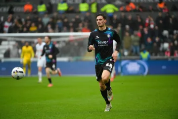 Noah Eile (Bristol City) em partida contra o Swansea, no dia 21 de fevereiro de 2026 (Crédito: Action Plus Sports Images / Alamy Stock Photo)