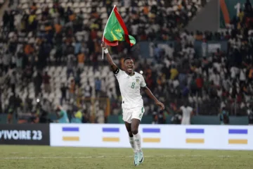 Bodda Mouhsine, jogador da Mauritânia, celebrando vitória do time na Copa das Nação Africanas