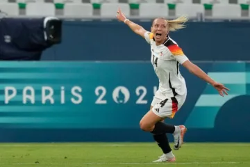 A alemã Elisa Senss comemora após marcar o quarto gol de sua equipe durante a partida do Grupo B de futebol feminino entre Zâmbia e Alemanha. (Associated Press / Alamy Stock Photo).