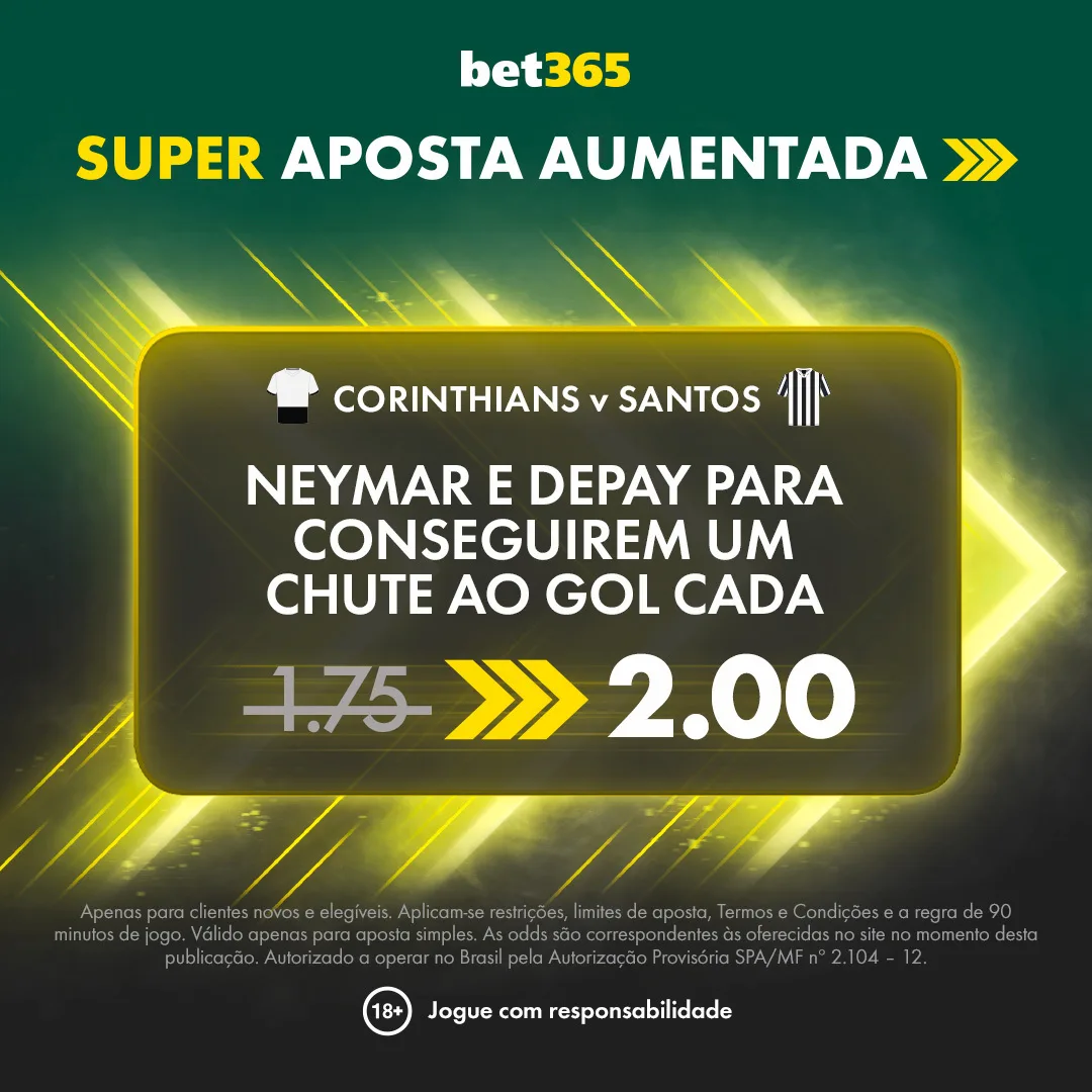 Para este grande clássico entre Corinthians e Santos, na nona rodada do Campeonato Paulista, a bet365 preparou uma Super Aposta Aumentada. E a oferta é para Memphis Depay e Neymar conseguirem um chute ao gol cada.