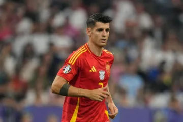 O espanhol Álvaro Morata corre durante uma partida semifinal entre Espanha e França no torneio de futebol Euro 2024 em Munique, Alemanha, terça-feira, 9 de julho de 2024. (Associated Press / Alamy Stock Photo)