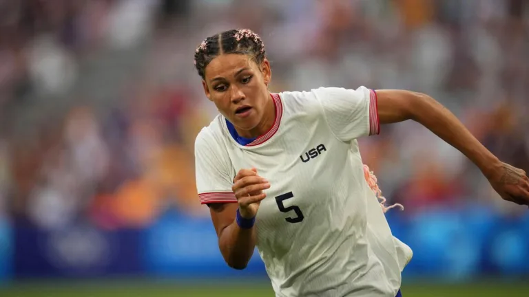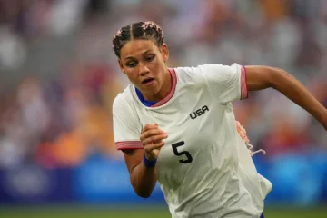 Trinity Rodman, dos Estados Unidos, durante uma partida de futebol feminino do Grupo B entre Austrália e Estados Unidos. (Associated Press / Alamy Stock Photo).