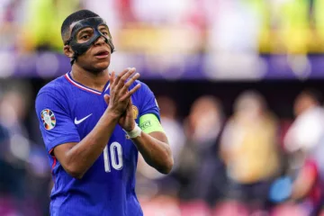 Kylian Mbappe, da França, com máscara, agradece aos fãs durante a partida do Grupo D - UEFA EURO 2024 entre França e Polônia no BVB Stadion Dortmund em 25 de junho de 2024 em Dortmund, Alemanha. (Agência BSR / Alamy Stock Photo)