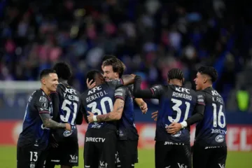 Lautaro Diaz, no centro, do Independiente del Valle do Equador comemora o segundo gol de sua equipe contra o Liverpool do Uruguai durante uma partida de futebol do Grupo F da Copa Libertadores no estádio Banco Guayaquil em Quito, Equador, quinta-feira, 30 de maio de 2024. (Associated Press / Alamy Stock Photo)