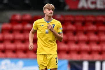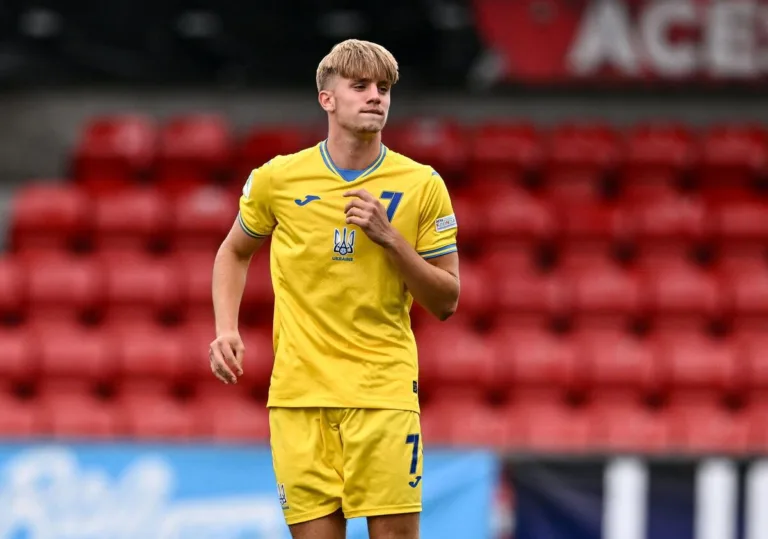 Kristian Shevchenko, da Ucrânia, durante a partida de futebol da fase de grupos do Campeonato Europeu Sub-19 da UEFA entre a Noruega e a Ucrânia. (Sipa US / Alamy Stock Photo).
