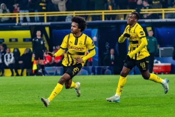 Karim Adeyemi comemora gol no jogo de ida. Foto: dpa/Alamy Live News