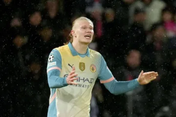 Erling Haaland, do Manchester City, comemora após marcar o segundo gol de sua equipe durante a partida de abertura da Liga dos Campeões entre Paris Saint-Germain e Manchester City. Foto: AP Photo/Thibault Camus