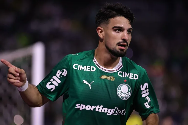 Flaco Lopez comemora seu gol na vitória do Palmeiras contra o Mirassol, no dia 17 de janeiro (Crédito: Associated Press / Alamy Stock Photo)