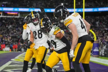 O safety do Pittsburgh Steelers, Minkah Fitzpatrick (39), comemora sua interceptação com companheiros de equipe durante o segundo tempo de um jogo de futebol americano da NFL contra o Baltimore Ravens. Foto: AP Photo/Stephanie Scarbrough