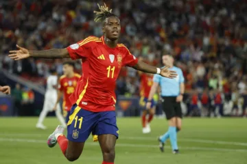 Nico Williams celebrando seu gol contra a França, no dia 05.06.2025. Foto: Independent Photo Agency / Alamy Stock Photo