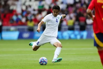 Khusniddin Alikulov do Uzbequistão cruza a bola durante a partida dos Jogos Olímpicos de Paris 2024 entre Uzbequistão e Espanha no Parc des Princes em 24 de julho de 2024 em Paris. (Associated Press / Alamy Stock Photo)