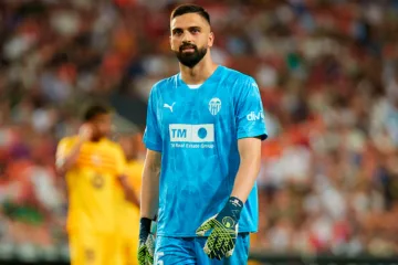 Em jogo oficial, Giorgi Mamardashvili (Valencia) no dia 17 de agosto de 2024 (© Magara Press SL / Alamy Stock Photo)