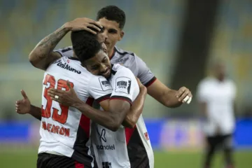 Willian Oliveira Jogador do Vitoria comemora vitória com Janderson jogador de sua equipe após a partida contra o Fluminense no estádio do Maracanã pelo campeonato Brasileiro A 2024. (Associated Press / Alamy Stock Photo)