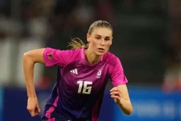 A alemã Jule Brand corre para pegar a bola durante a partida de futebol feminino do Grupo B entre Estados Unidos e Alemanha no estádio Velódromo, durante as Olimpíadas de Verão de 2024. (Associated Press / Alamy Stock Photo).